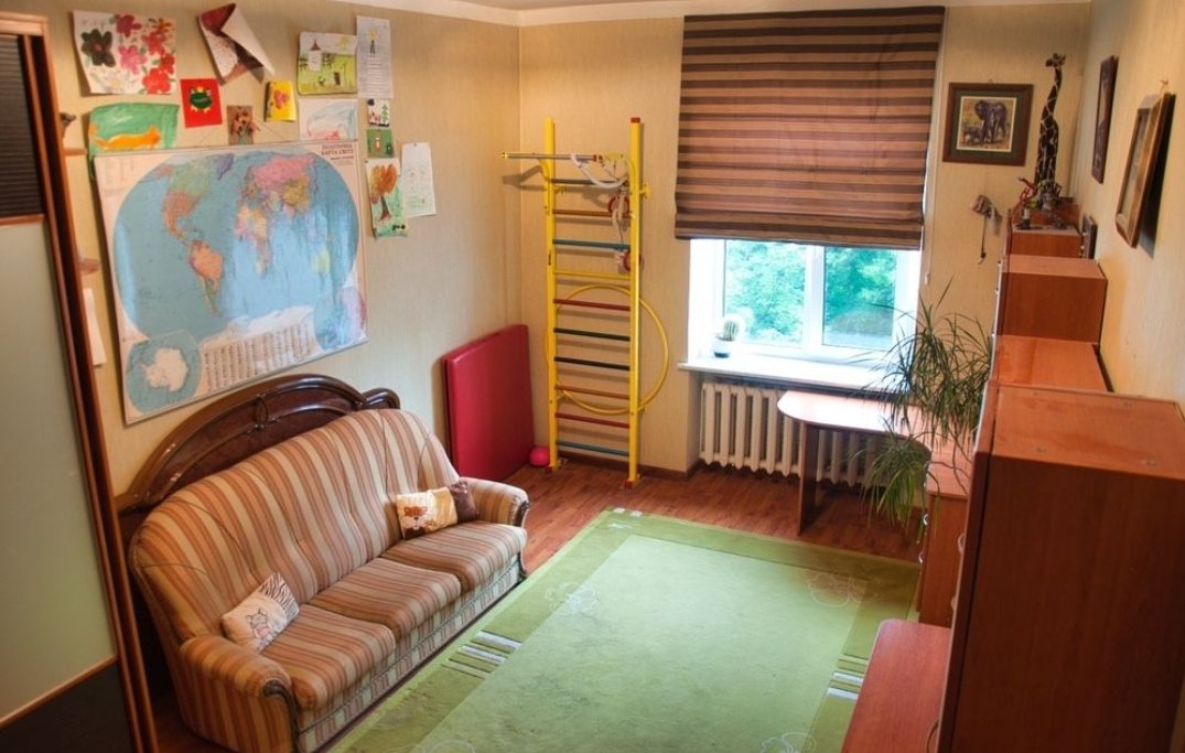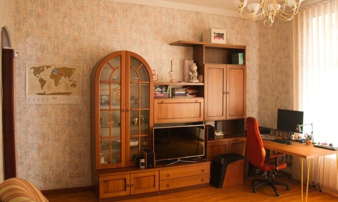 Три кімнати (2 роздільні, одна прохідна), велика кухня, роздільний санвузол, балкон. Висота стель - 3.10 м.